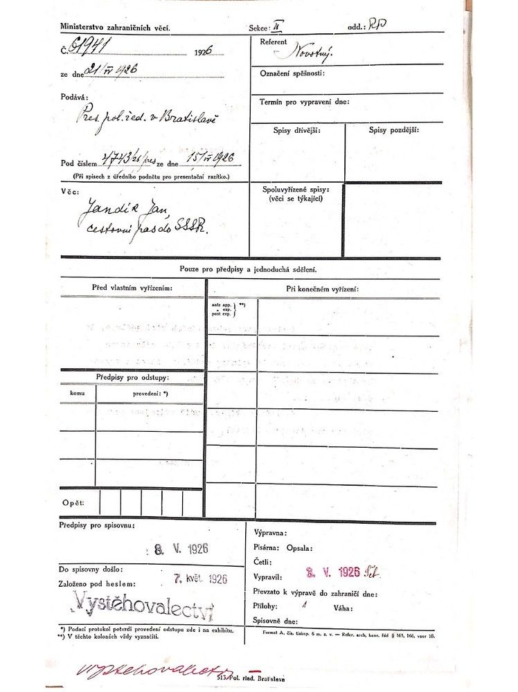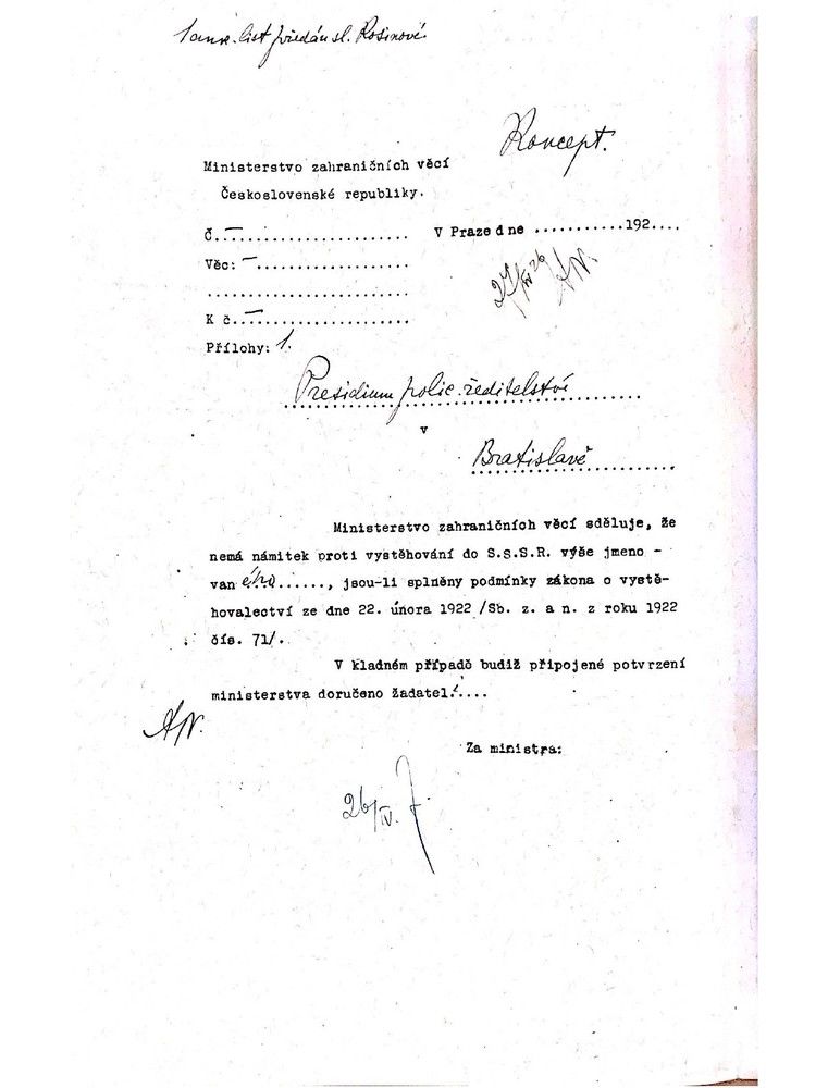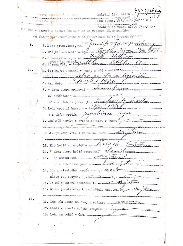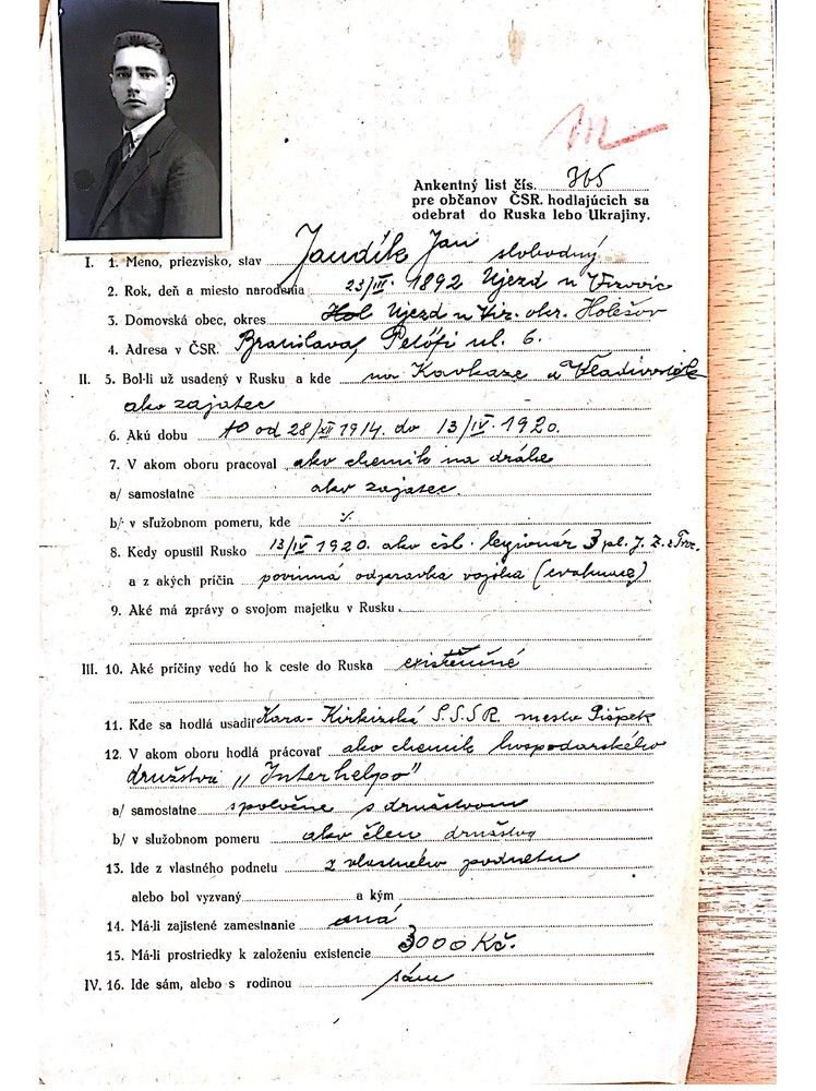 V dotazníku Ministerstva zahraničních věcí pro občany ČSR “hodlající se odebrati do Ruska nebo Ukrajiny” uvádí, že v Turkestánu bude pracovat jako chemik. Do Pišpeku (dnes Biškek) na území dnešního Kyrgyzstánu odjel mezitransportem Interhelpa 11. října 1925 pod pořadovým číslem člena družstva 157. Ve Frunze pracoval na pozici hlavního účetního v lihovaru.