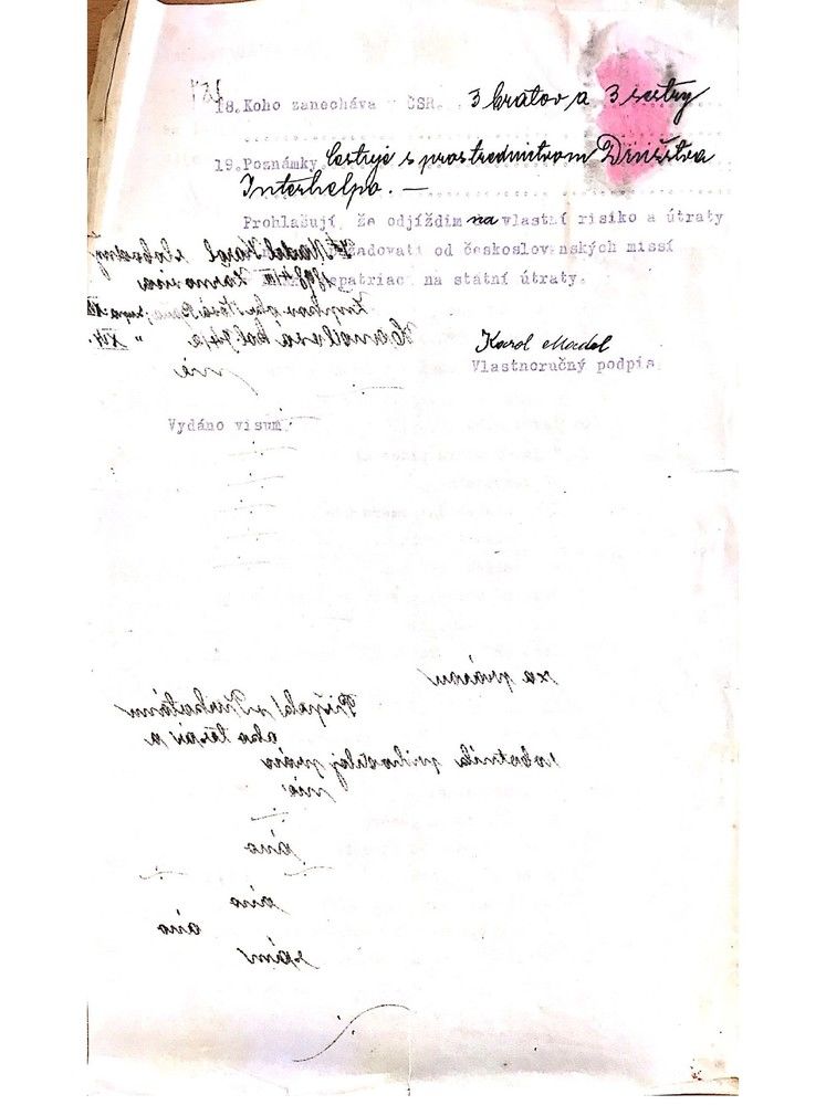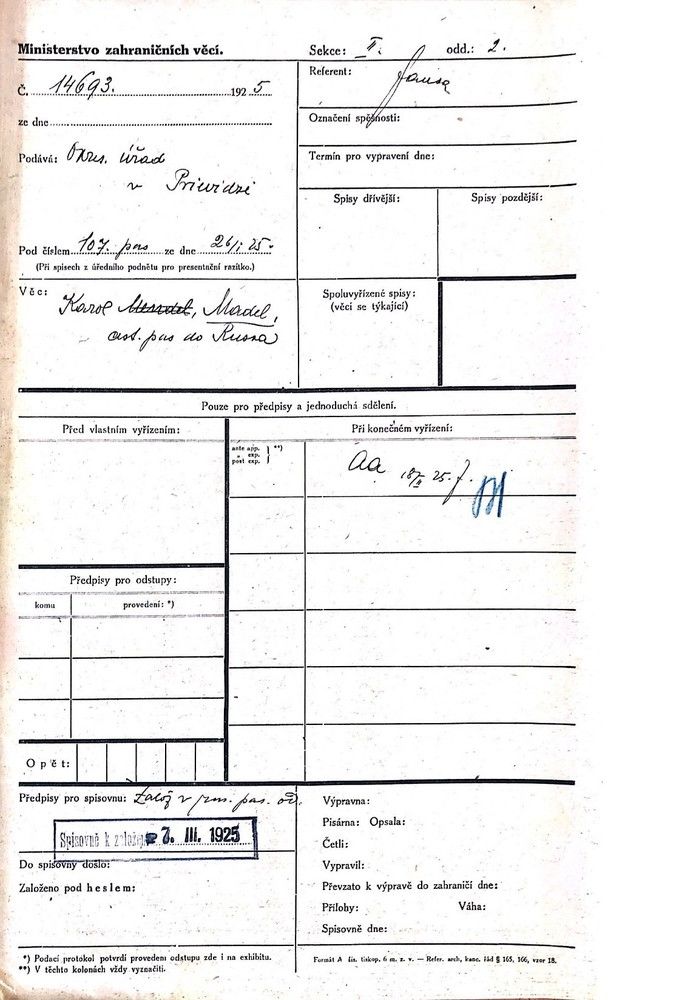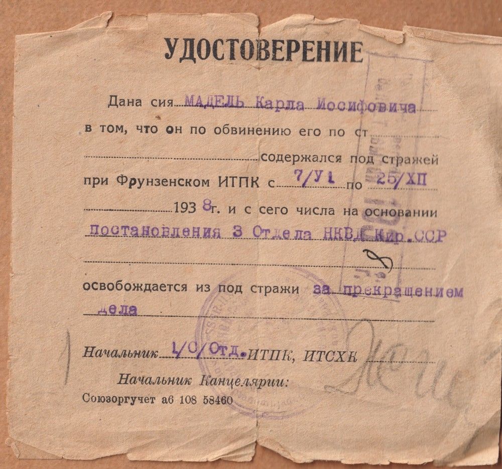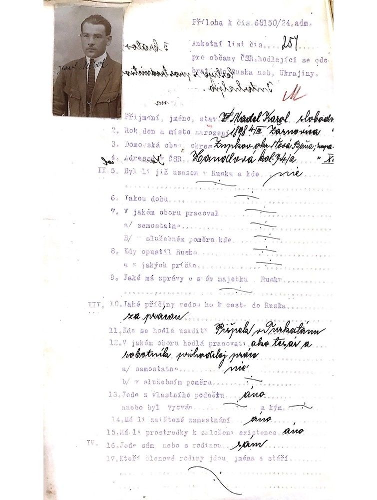 V dotazníku Ministerstva zahraničních věcí pro občany ČSR “hodlající se odebrati do Ruska nebo Ukrajiny” uvádí, že v Turkestánu bude pracovat jako tesař. Z rozhovorů s jeho potomky žijícími v Kyrgyzstánu víme, že i on se stal během Velkého teroru obětí represí. Ve vazbě byl od 7. června do 25. prosince 1938.